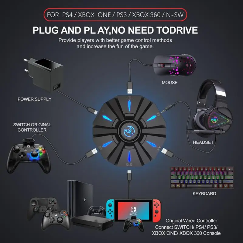 Start the console and connect the adapter via an USB TYPE-C data cable ( USB port plug to the console, TYPE-C port plug to the converter) then LED white light.Plug the original wired controller to guide the yellow LED light.Insert the keyboard then LED red light ;insert the mouse then LED green light.After all connected,the LED will breathe in circulation from yellow,cyan,purple and pink.