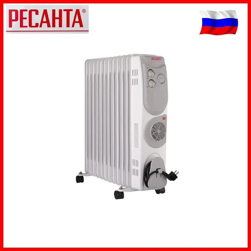 Мощность представленного здесь радиатора РЕСАНТА ОМ-12НВ равна 2900 Вт. Секции выполнены из стали. Они окрашены в белый цвет. Части из прочного пластика сделаны в сером оттенке. Есть колесики из черного пластика и ручка для удобства перемещения, ведь оборудование весит 11.5 кг. Имеется отсек в виде катушки, куда можно убрать шнур. Производители позаботились о безопасности пользования, наделив нагревательный прибор защитой от перегрева.