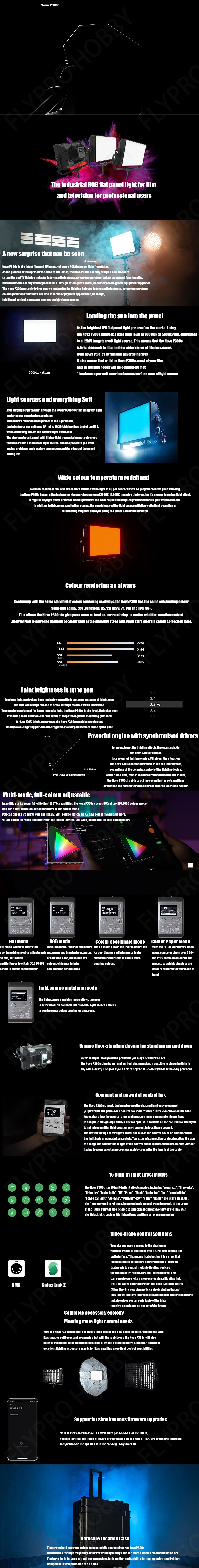 Nova P300c Panel Light The Aputure Nova P300c is a RGBWW panel light with an output that Aputure says is comparable (in certain instances) to the ARRI Skypanel S30. Because it's an RGBWW light, (red, green, blue and two whites – both daylight and tungsten hence the WW at the end-), it can simulate various filter effects and colour gels, including colour correction up to 10,000K with green/magenta shift. It also offers special effects, such as flashing police lights, party lights and TV static. The Nova P300c can be plugged into a continuous power source such as a wall plug, or powered by two 90Wh V-Lock batteries which Aputure says should provide around 1 hour 45 minutes of runtime. Nova P300C Key Features ·300W RGBWW LED Soft Light Panel – Up to 9000lux at 1 meter ·CRI & TLCI >95+ ·Soft 120° Beam Angle ·Fully Tunable CCT from 2000K to 10000K ·Tunable Green-Magenta Adjustment in CCT Mode (Full Plus/Minus Green) ·RGB Colour Tunability with Hue, Saturation & Intensity Control ·Industry-standard X,Y (CIE 1931): Colour Coordinate Adjustment to Match Other Lights ·90% of Colours Within Rec.2020 Colour Space ·300+ Industry-Standard Gel Presets Built-in ·15 Built-in Lighting FX: Cop Car, Lightning, Paparazzi, Candle, Fire, etc. ·User-Programmable Presets ·Stepless Dimming from 0 to 100 % with no colour shift ·User Programmable Presets ·Sidus Link App Compatible (Sidus Mesh TM ) ·Onboard 5-Pin DMX512 In & Out ·Extendable Control Box w/ Lightning Clamp QR Plate ·0.6m & 3m-long Head Cables for Flexibility & Organization ·4-Pin XLR DC 24V(15A)-48V(7.5A) Battery Input – Built-in Internal Ballast ·Neutrik powerCON Locking Power Cables ·Dual Junior/Baby Pin (28mm/16mm) for Mounting on Any Stand ·Handbrake-locking Yoke with 360° Tilt