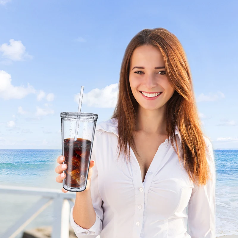 The double walled structure reduces condensation and will not stain tables and countertops. Along with the acrylic material, the double wall reduces heat loss and will keep your drinks colder and hotter than an average cup.