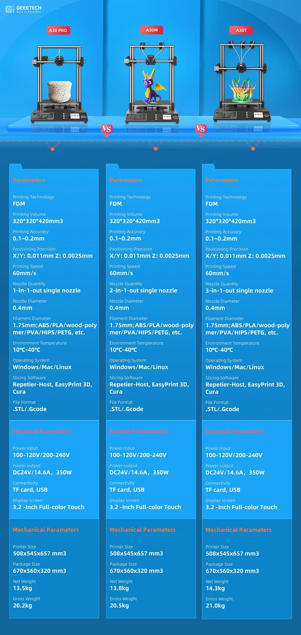 1. Mix Color(A30M and A30T, not A30 Pro): Three extruder modules and 3-in-1 out hotends, the mix color objects. The Geeetech A30T 3D printer delivers mix-colour objects and greatly enrich your 3D printing life.