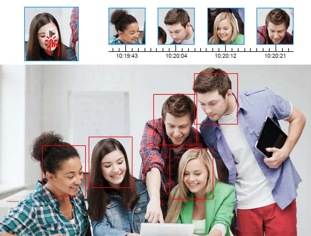 Распознавание лица, воспроизведение лица и запись лица; Быстрое снятие изображений лица и быстрое воспроизведение видео лица; Распознавание лица: автоматическое снятие изображений лица; Воспроизведение лица: интеллектуальное воспроизведение видео лица, экономия времени, не пропустите все детали;