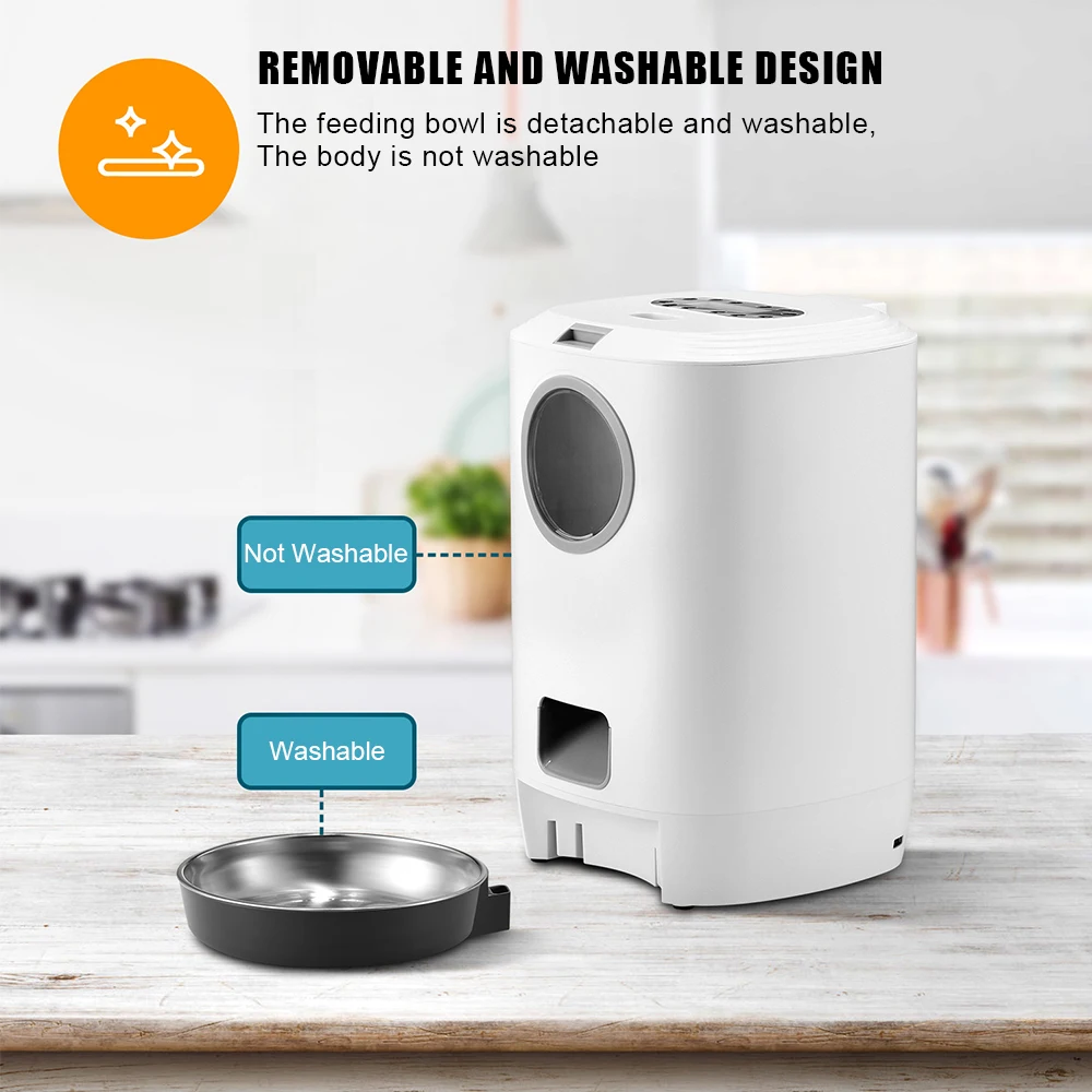 4,5 литров пищевой емкости: автоматическая кормушка для домашних животных составляет 4,5 литров, подходит для маленьких и средних домашних животных. Эта кормушка для собак Обеспечит вашего питомца едой на несколько дней, чтобы избежать голода, особенно когда вы работаете сверхурочно, на ночь или в командировках.Инфракрасная индукция: с инфракрасным умным датчиком, когда чаша наполняется определенным количеством, устройство автоматически остановится, предотвращая переполнение еды.Съемный и легко моющийся: резервуар для еды с автоматической кормушкой для домашних животных съемный, а лоток для еды из нержавеющей стали съемный для легкой очистки. Специальная конструкция с защитой от кнопок проста в установке, а основание устойчивое и нескользящее для защиты домашних животных. Встроенный инфракрасный датчик может контролировать заполнение еды.Гибкий график подачи: эта конструкция кнопок позволяет устанавливать время приема пищи (часы, минуты) и размер приема пищи (размер приема пищи). Эта кормушка для домашних животных может распределять еду в соответствующее время, 1-4 раза в день (завтрак, обед, ужин, 4-е прием пищи), при каждом приеме до 20 порций (до 100 граммов).Диктофон: вы можете нажать и записать голос, чтобы напомнить питомцу о необходимости есть. Это голосовое сообщение длится 10 секунд. Умная кормушка для домашних животных будет автоматически играть 3 раза перед каждым приемом пищи, чтобы напомнить им о необходимости регулярно есть, сохранять здоровье и чувствовать расслабленность, когда вас нет дома.Двойной режим питания и безопасность: Этот кормушка для домашних животных имеет двойное питание, режим батареи (требуется батарея 3D размера) и режим питания адаптера переменного тока. В случае полной мощности режим аккумулятора гарантирует, что ваш питомец съест вовремя. Кроме того, эту автоматическую кормушку для домашних животных нельзя размещать на улице или под дождем. Держите его сухим, чтобы вода не попала в кормушку.Спецификация: