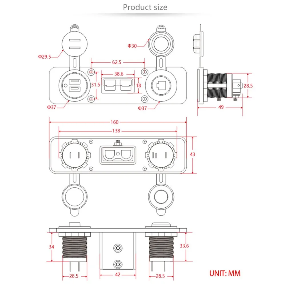 Монтажный кронштейн с утопленным разъемом 50A Anderson и 2 usb-гнезда и гнезда для прикуривателя для монтажа в планки и панели.