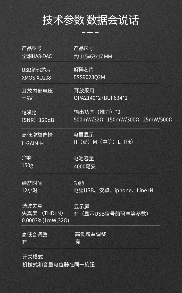Контроль качества звука всегда преследовал всех инженеров. HA3 использует усовершенствованный чип XMOS в отрасли с более низким дрожанием и более низким энергопотреблением. Вместе с профессиональным декодером ES9028Q2M от US ESS третьего поколения музыка спокойная и стройная. OPA2140-это Высокоточный операционный усилитель звука, который я хочу сначала открыть и использовать. В сочетании с высокой скоростью и высоким током на выходе BUF634, звуковой баланс многослойный и аутентичный.