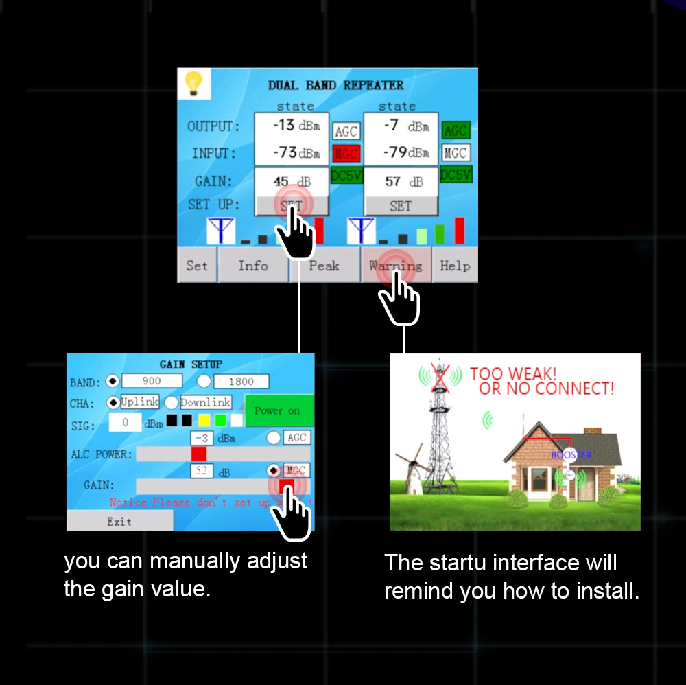 Функции AGC и MGC могут предотвратить возникновение помех на базовую станцию усиленным сигналом. Даже если он установлен неправильно, усилитель может защитить нормальную работу базовой станции.