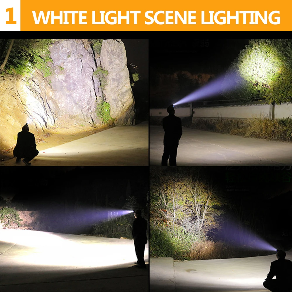 Фара включает в себя 4 светильник ing режимы: полный Яркость, низкая Яркость, стробоскоп, SOS, полная УФ-и белый светильник. Вы можете изменить режим освещения с помощью полуглубокой нижней кнопки, чтобы удовлетворить ваши требования.