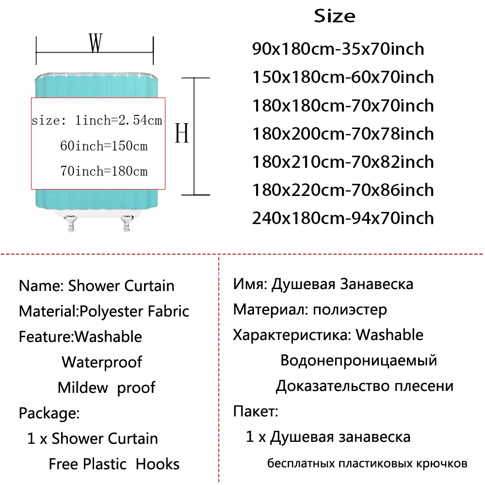 Описание: Идеально подходит для большинства стандартных ванных комнат; Просто Повесьте его на стальную трубку. Предотвращает брызги воды из душевой кабины Экологически чистый Устойчив к выцветанию; Сохраняет цвет при стирке. Мягкие и комфортные ощущения Может служить простой и заниженной занавеской для душа самостоятельно, оснащен крючком для легкой установки без каких-либо усилий. Оснащен c-образными крючками для штор Спецификация: 100% новые и высококачественные Материал: 100% полиэстер Рисунок: как на картинке Функция: Водонепроницаемость Машинная стирка Примечание: Машинная стирка в холодной воде. Не отбеливать и не сушить в стиральной машине. Из-за разницы между различными мониторами изображение может не отражать фактический цвет изделия. Возможны отклонения в 1-2 см вследствие измерений вручную. Политика доставки и обработки Покупатель несет ответственность за любые применимые импортные пошлины и местные налоги. Перед совершением покупки, пожалуйста, свяжитесь с таможней. Проверьте свой адрес во время оформления заказа. Мы не несем ответственности за любые неправильные адреса.