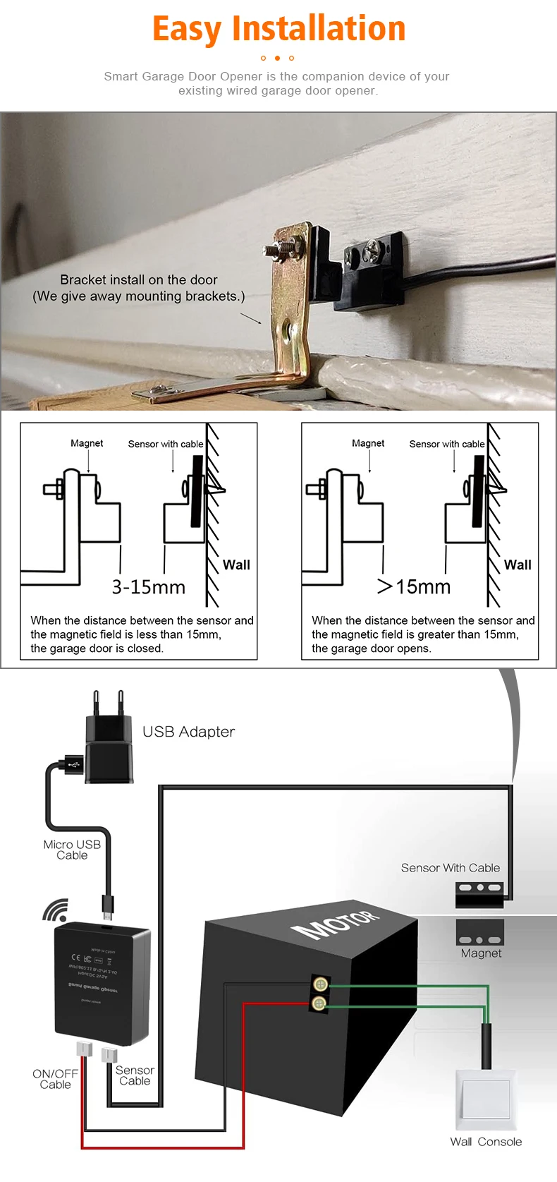 Remote Monitoring: You can open or close the door by the APP. You can check the garage door open or closed state in real time. You can authorize multiple people to access your garage.