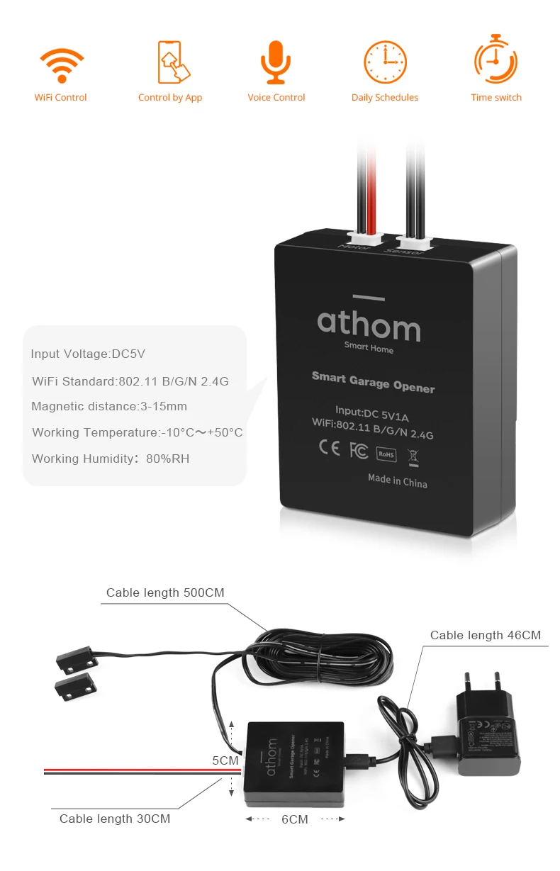 Voice control: Garage Door Opener is compatible with Apple HomeKit, Apple Watch, Siri. Control your smart Opener through voice commands, easily turn on/off (E.g. "Hey Siri, open Garage Door ")