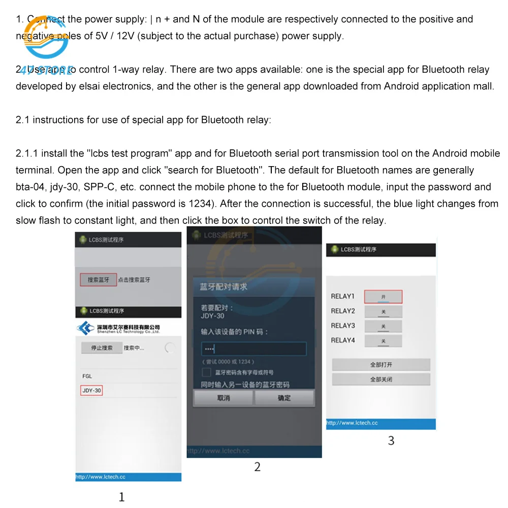 2.1.1. Установите приложение «Программа тестирования LCBS», инструмент для трансмиссии последовательного порта Bluetooth на мобильный телефон Android, откройте приложение и нажмите «Поиск Bluetooth», имя Bluetooth по умолчанию обычно BTA-04, JDY-30, SPP-C, И т. Д. Подключите мобильный телефон к модулю Bluetooth, Введите пароль и нажмите, чтобы подтвердить (начальный пароль-1234). После успешного подключения синий светильник переходит от медленного мигания к постоянному светильник, а затем нажмите на квадрат для управления реле.