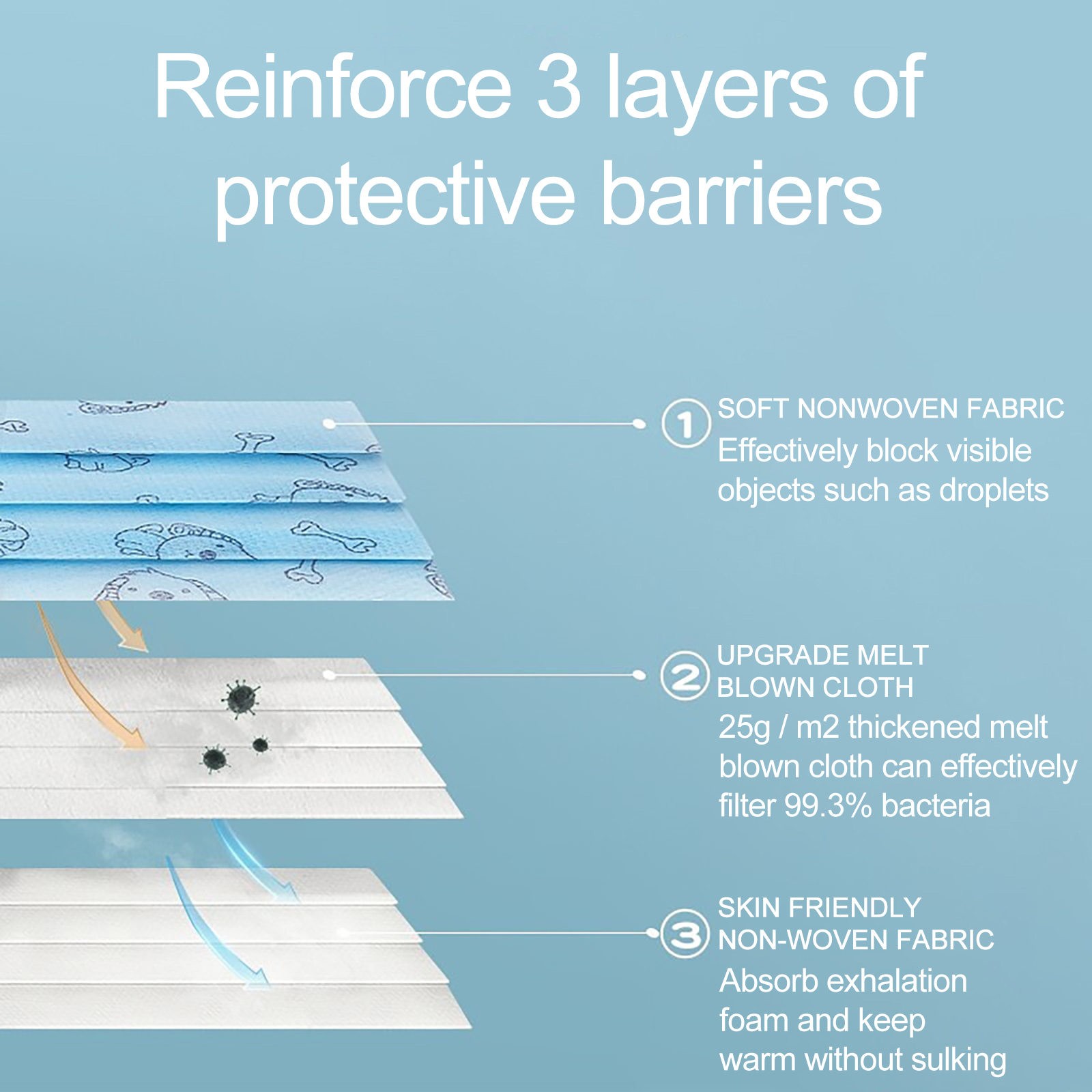 Включение:50x детские одноразовые маски для лицаПримечание: Если вы обнаружите дискомфорт, прекратите использовать его.Примечание:• Преобразование: 1 дюйм = 25,4 мм или 1 мм = 0,0393 дюйма, 1 см = 10 мм.Допускается ошибка в 1–3 мм из-за измерений вручную