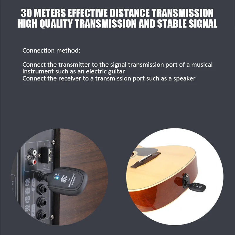Подключите передатчик к порту передачи сигнала музыкального инструмента, такого как электрогитара, подключите приемник к порту передачи, например, динамик