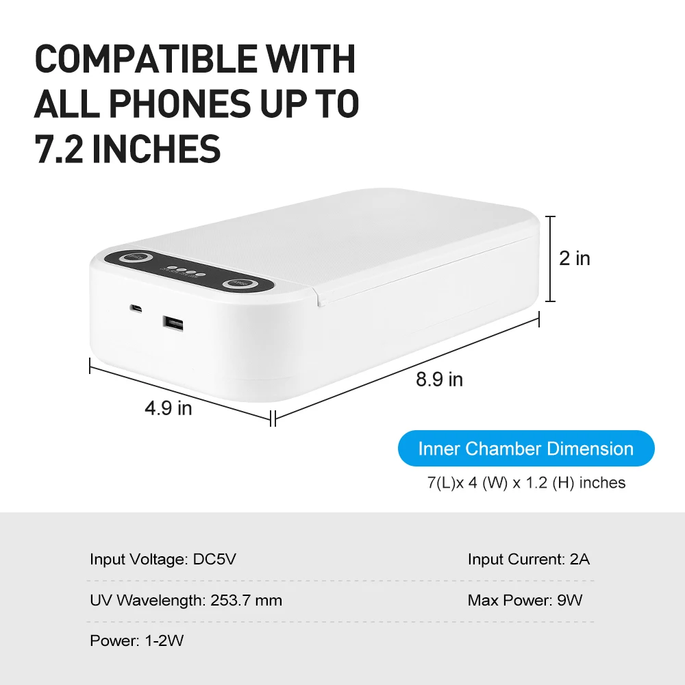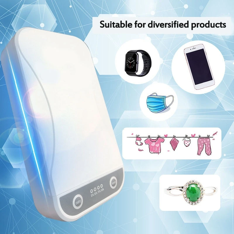 2, Совместимость с большим количеством устройств-это стерилизатор коробка может держать смартфон до 6,5 дюймов. Кроме мобильного телефона, он также может дезинфицировать маску для лица, ключи, ювелирные изделия, карты, кисти для макияжа и другие мелкие предметы. Идеальный подарок для себя и всех, кто заботится о гигиене.