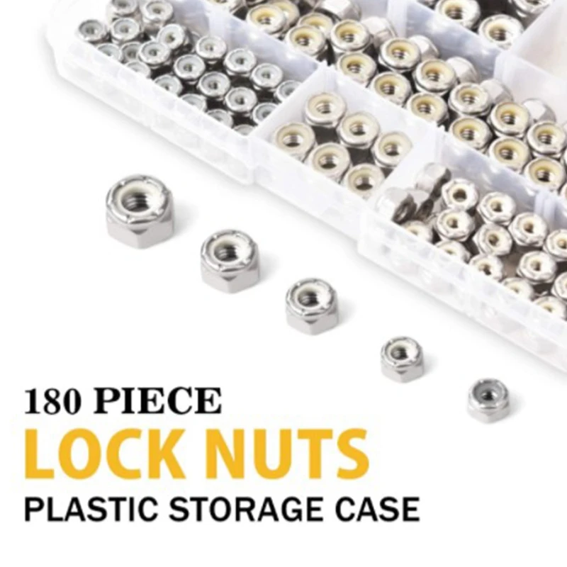180PCS 1/4-20 5/16-18 3/8-16 8-32 10-32 Lock Nuts Nylon Insert Nut Assortment Kit, 304 Stainless Steel Hex Locknuts