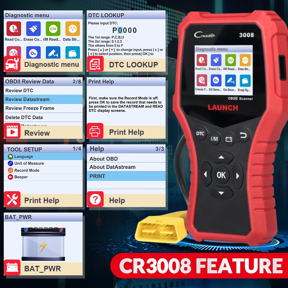 LAUNCH X431 CR3008 полный OBD2 сканер, считывание и удаление ошибок двигателя, тест на батарею, поток данных OBDII, поиск DTC, печать и бесплатное обновление онлайн