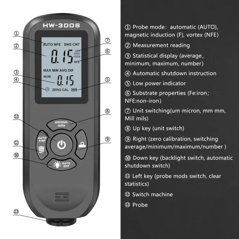 3. Датчик принимает точный интегрированный зонд и использует принципы электромагнитной индукции и вихревого эффекта тока, который автоматически определяет атрибут подложек.