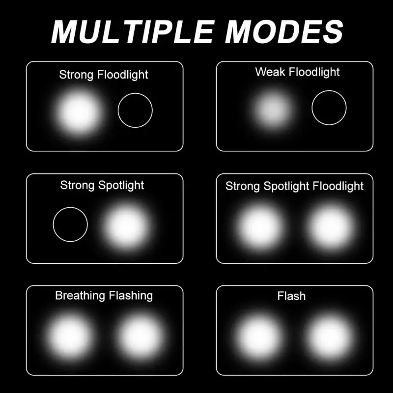 Режимы: 6 режимов, включая сильный светильник (широкий светильник), 100%-слабый светильник (широкий светильник), 50%-сильный светильник (точечный светильник), 100%-сильный светильник (2T6 полный светильник), дышащая вспышка (2T6) , мигающий (2T6)