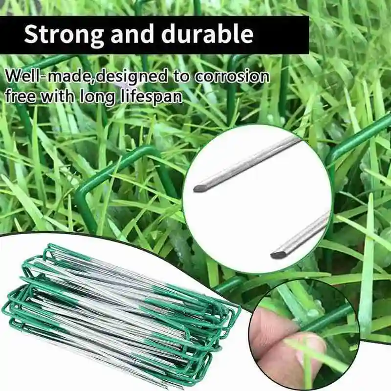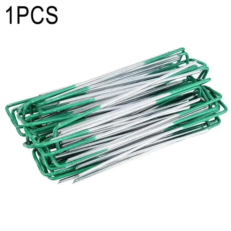 Эти оцинкованные стальные гвозди окрашены зеленой краской и предназначены для плавного смешивания в газон после успешного попадания в землю