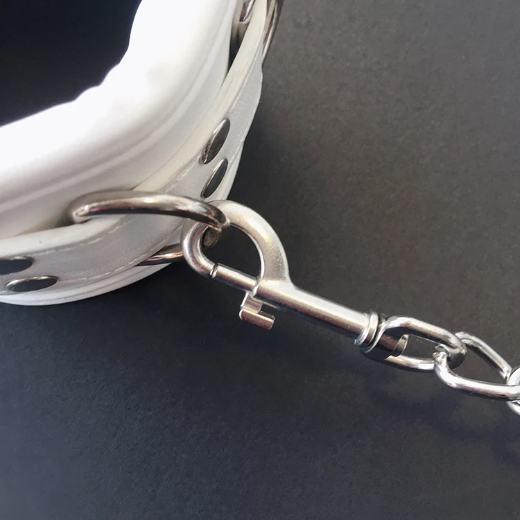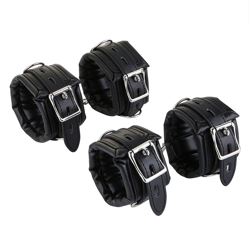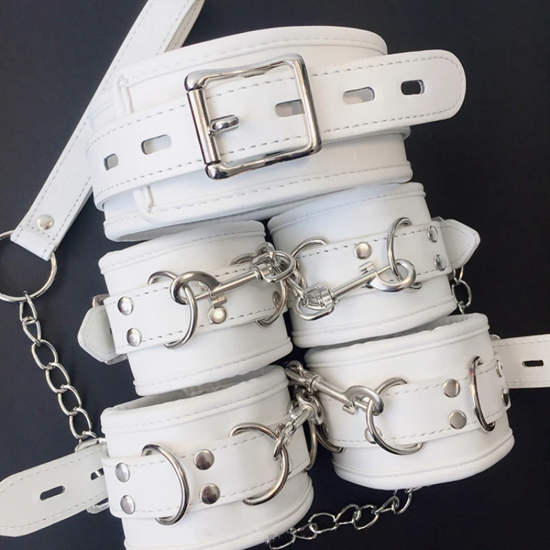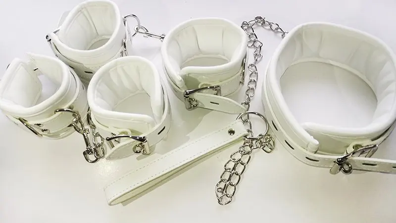 Удерживающие их в комфорте и стиле с этими черными манжетами на запястье из искусственной кожи, манжетами на лодыжке, воротниками на шее. Со съемной цепью, соединяющей их вместе.