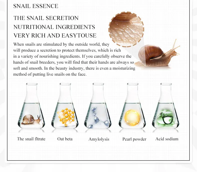 Улитка essenceTHE УЛИТКА СЕКРЕЦИИ питательные ингредиенты очень богатые и EASYTOUSEWhen улитки стимулируются внешним миром, они будут производить секрецию, чтобы защитить себя, который богат различными питательными ингредиентами. Если вы Внимательно наблюдайте за руками заводчиков улиток, вы обнаружите, что их руки всегда такие мягкие и гладкие. В индустрии красоты существует даже увлажняющий метод нанесения прямых улиток на лицо.