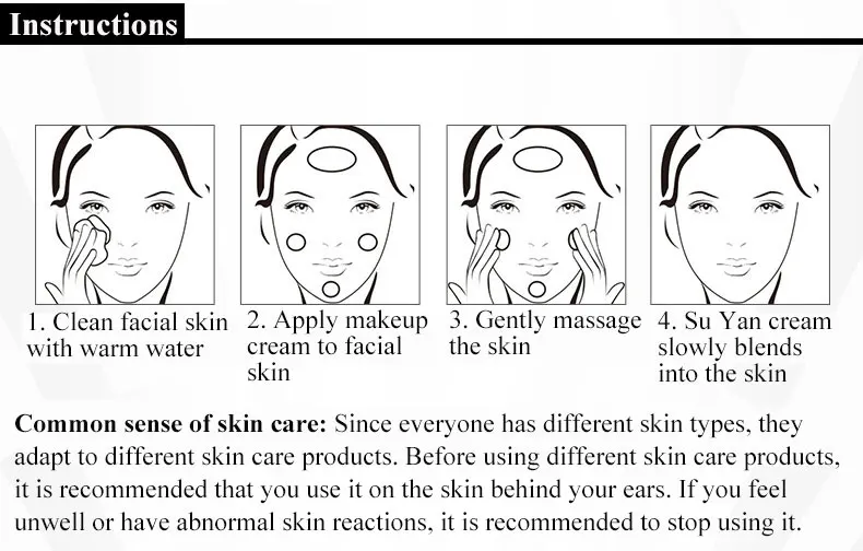 Instructions1. Очистите кожу лица теплой водой 2. Нанесите крем для макияжа на кожу лица 3. Мягко массируйте кожу 4. Крем Su Yan медленно переходит в чувство ухода за кожей: так как у всех разные типы кожи, они адаптируются к различным продуктам по уходу за кожей. Перед использованием различных средств по уходу за кожей рекомендуется использовать их на коже за ушами. Если вы чувствуете себя плохо или имеете ненормальные кожные реакции, рекомендуется прекратить их использование.