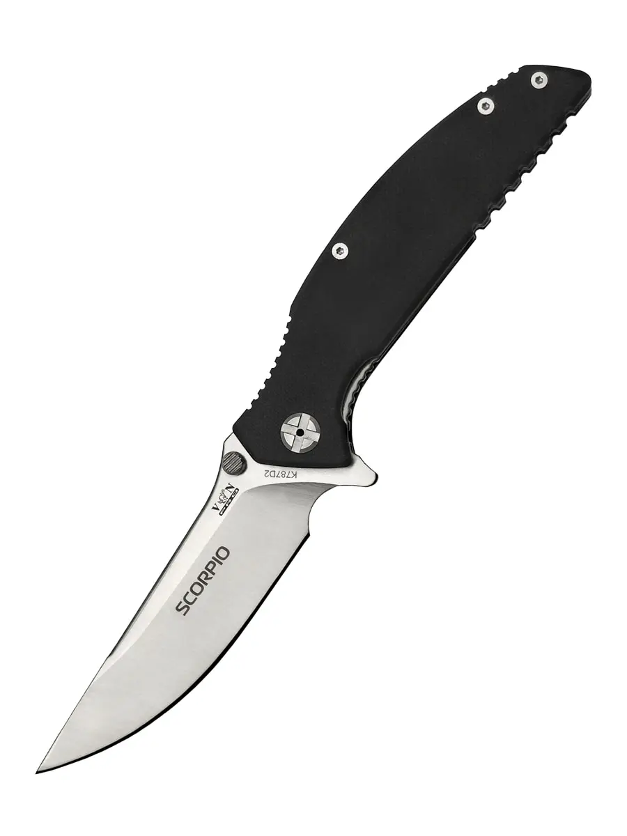 Тактический нож, который также хорошо послужит как городской, повседневного ношения. Хищно изогнутый клинок с удлиненной режущей кромкой великолепно режет, сохраняя возможность эффективно колоть. Сталь - легированная D2, отличающаяся повышенной твердостью. «SCORPIO» легко открывается одой рукой, двумя способами, при помощи флиппера и шпенька. В раскрытом виде флиппер образует небольшой односторонний упор. Рукоять сделана из высокопрочного материала G10, имеет сложную форму с упором для большого пальца. Она ложится в ладонь, как влитая и не сковывает движения, позволяя совершать хирургически точные манипуляции. Нож укомплектован клипсой для удобного ношения в кармане.