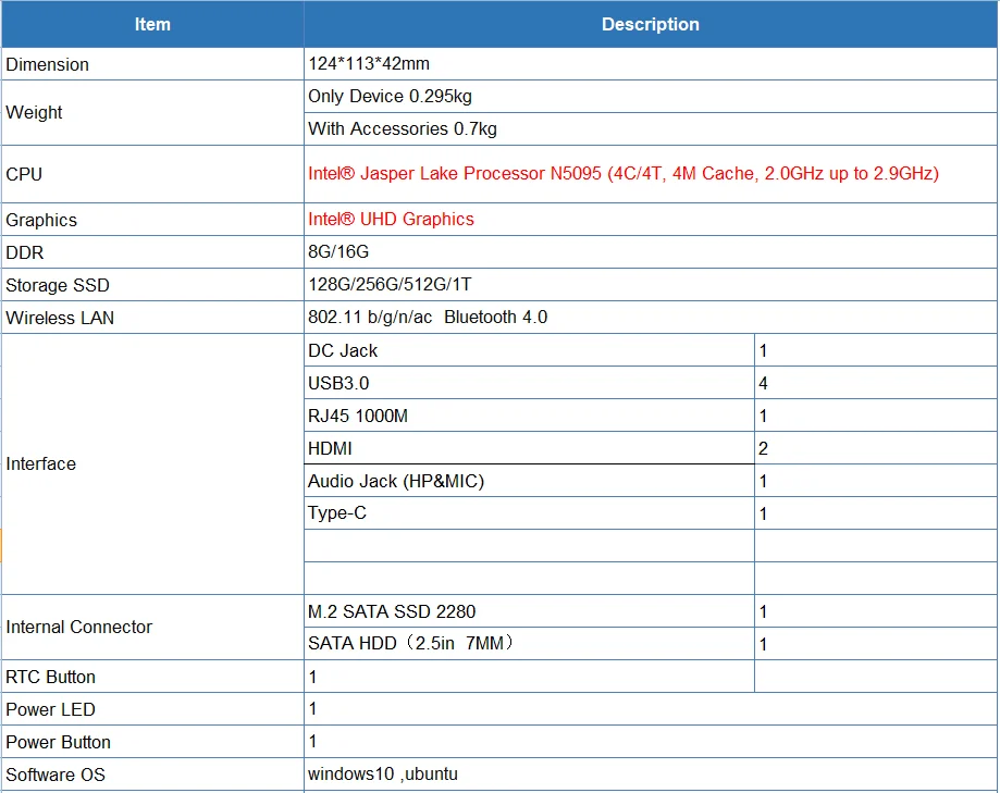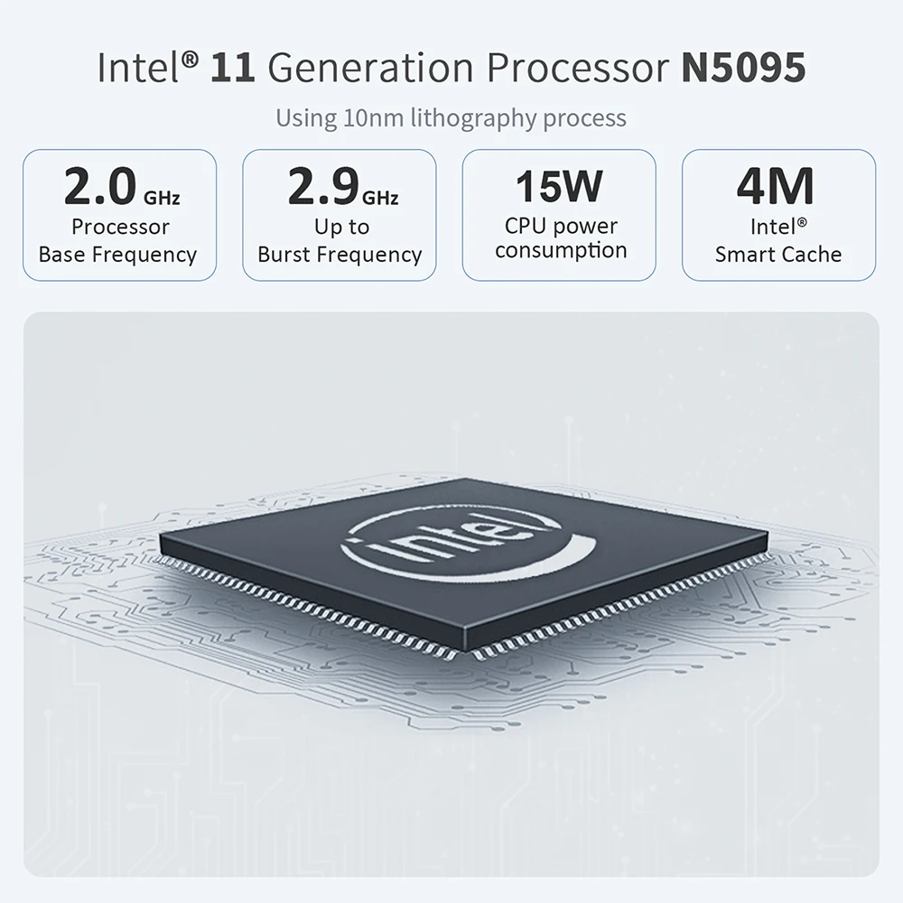 Процессор: Intel®Джаспер процессор N5095 (4C/4T, и формирующая листы для кровли 4 м Кэш, 2,0 ГГц до 2,9 ГГц)