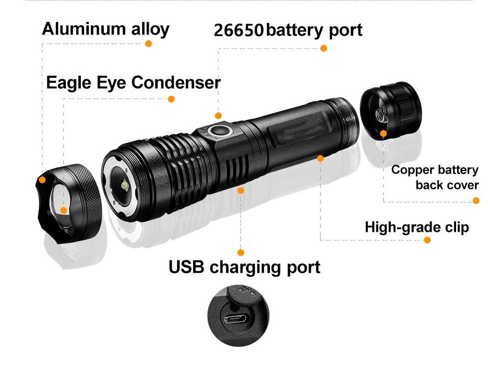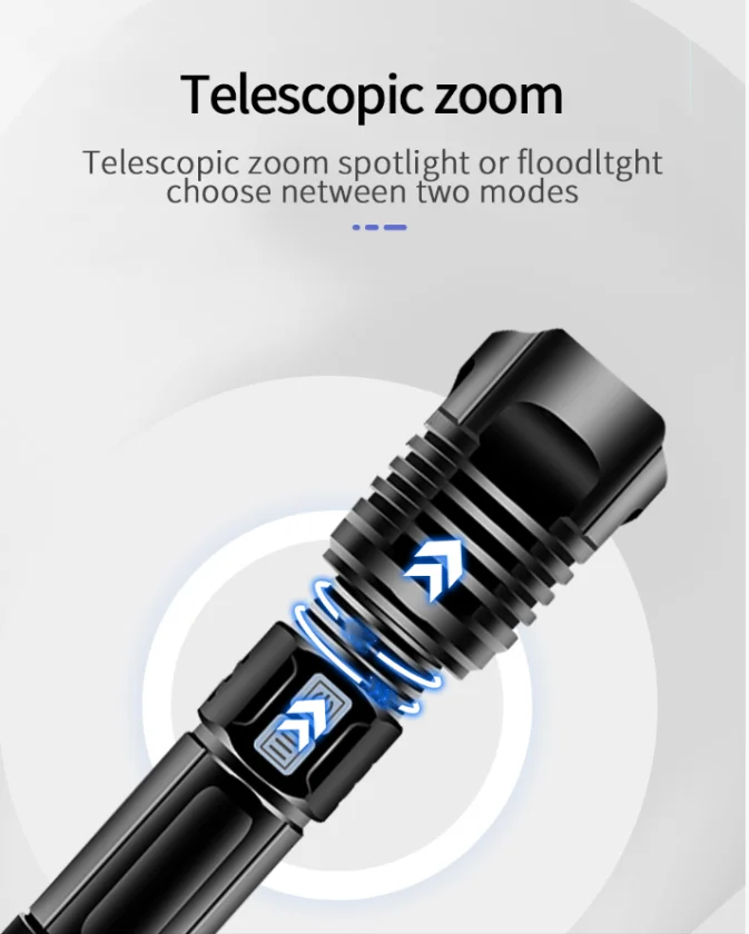 Using the latest XHP190 LED wick, two power buttons, one of which is the super bright mode function button, is a must-have flashlight for hunting, camping, fishing, hiking, climbing and other outdoor activities enthusiasts. Click to bring you With the super bright white light, double-tap in quick succession can bring up the flash mode, which can drive away beasts, self-defense, and ask for help.