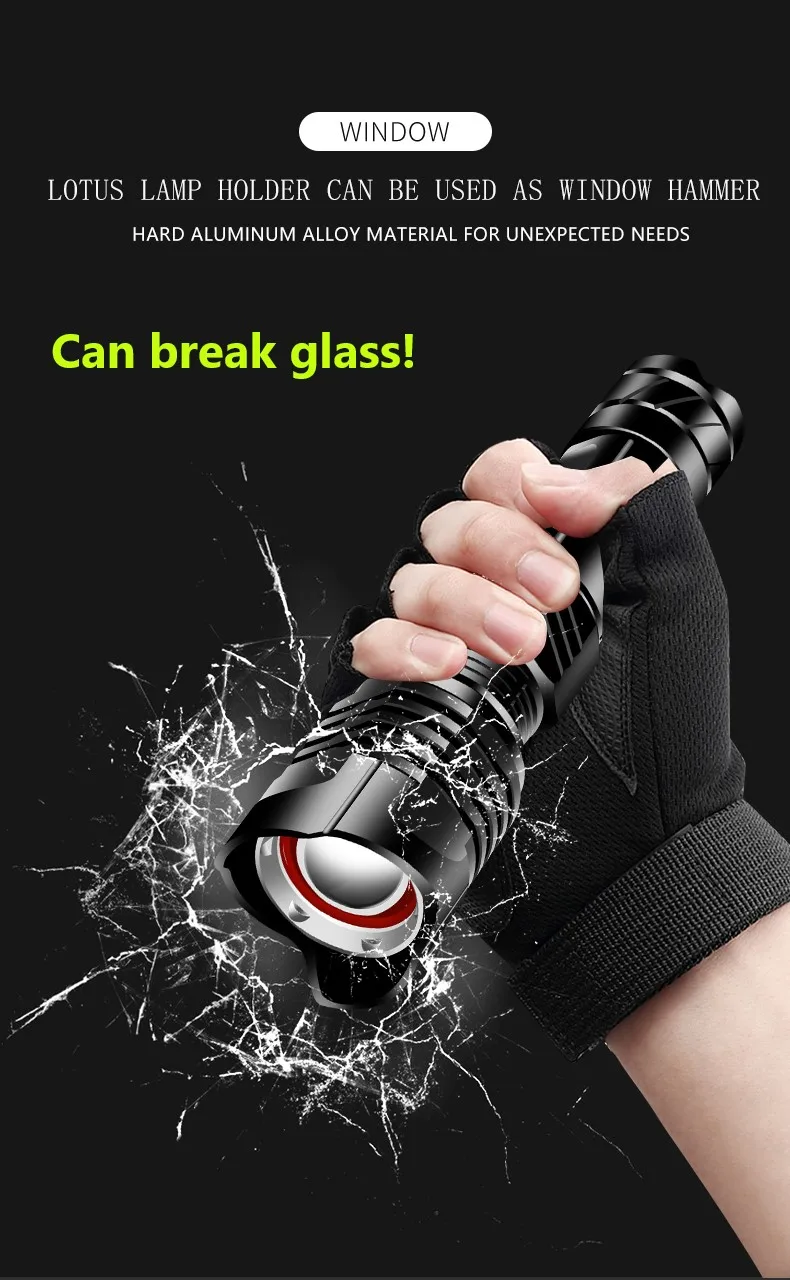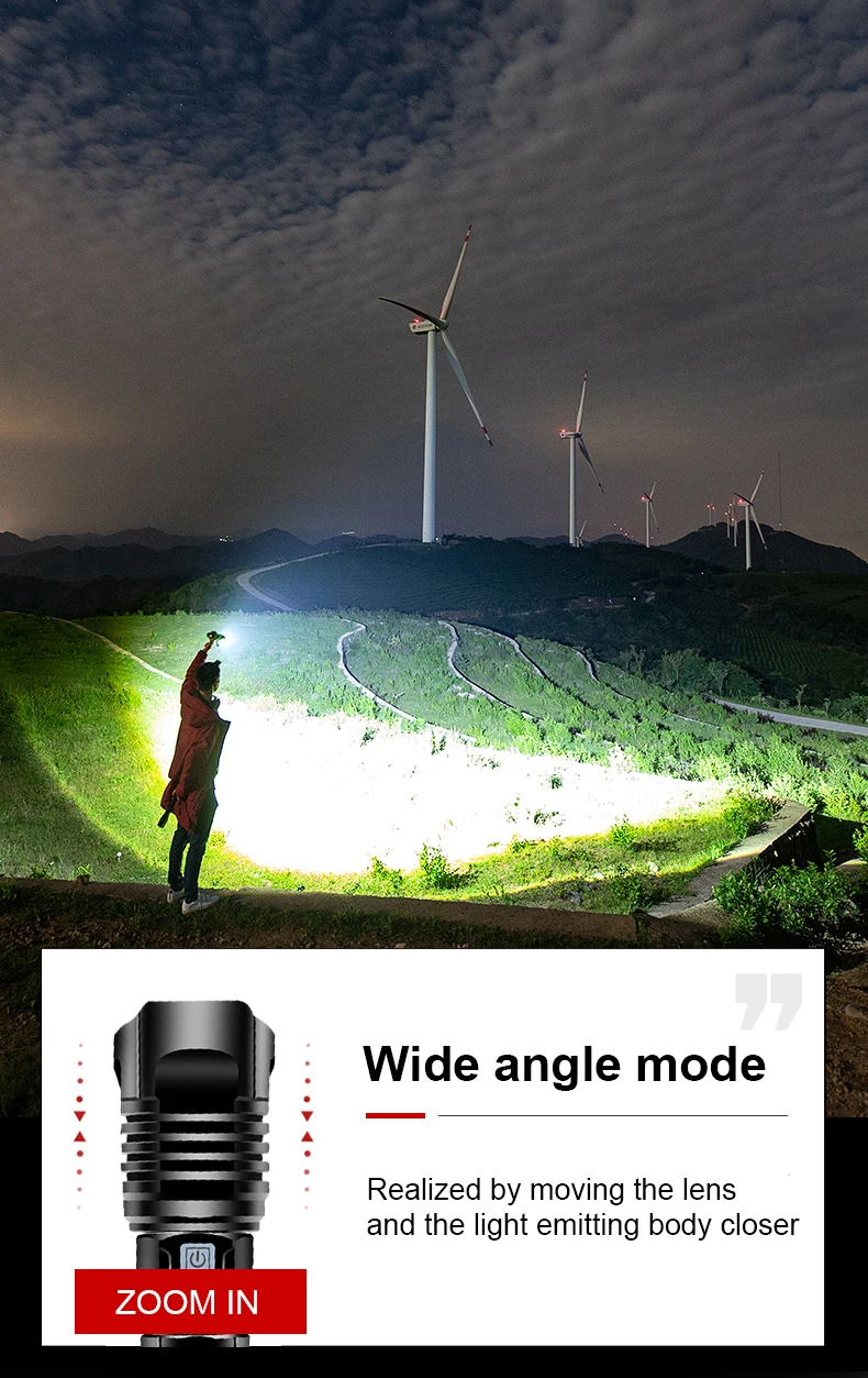 Using the newly developed 9-core XHP190 LED wick, a new generation of one-button super bright mode is added to satisfy friends who like super bright brightness. It has five lighting modes to meet the needs of various scenes. The head of the flashlight is equipped with a new rain-proof concave-convex design. This product can be used well in rainy weather and is suitable for severe rainy weather and blizzard weather. Using high-capacity 26650 battery, it can keep on for more than 500 minutes, and the lighting distance is more than 1600 meters. It can bring you super bright white light at night, suitable for hunting, camping, fishing, hiking, climbing, climbing and other outdoor activities.