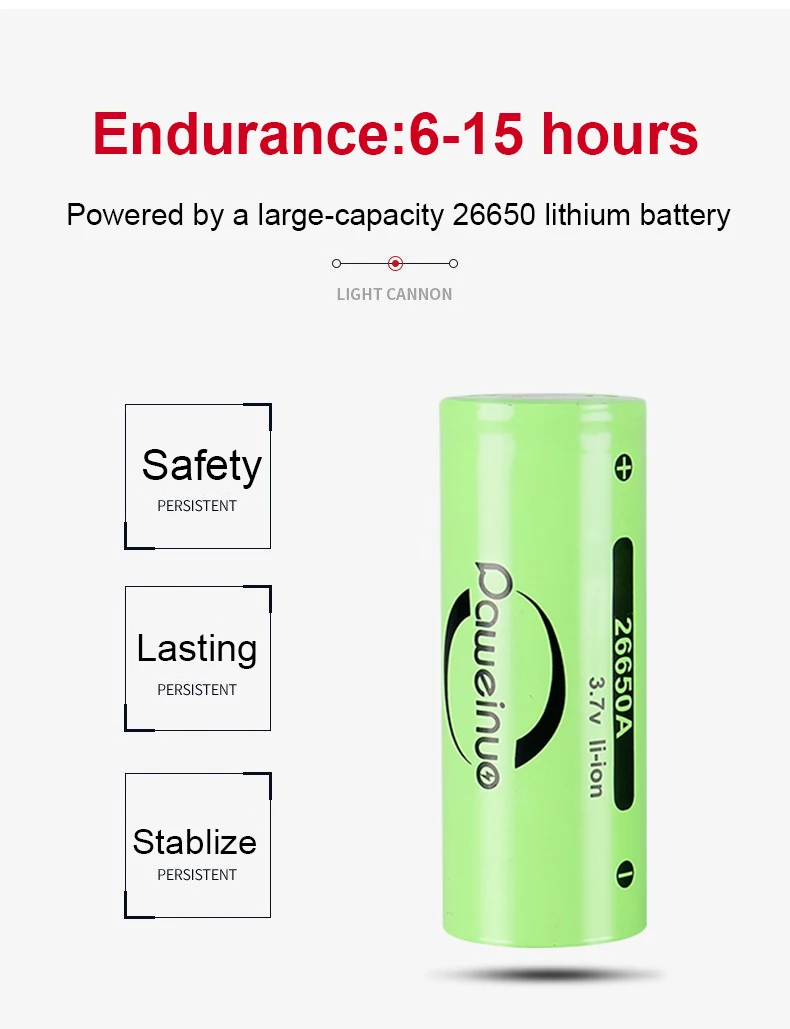 Lighting time: 1*18650 battery 8 hours; 1*26650 battery: 12 hours