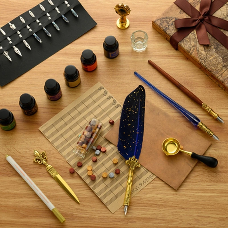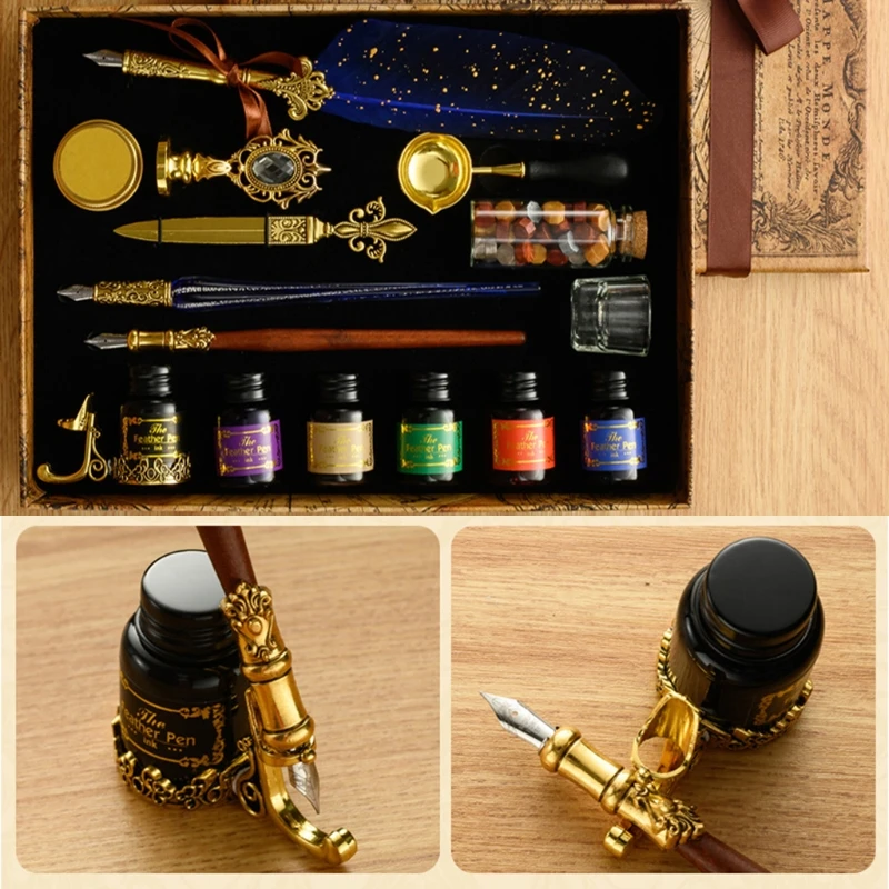Набор перьев в стиле ретро. Посылка включает в себя 1 перо Dip Ручка стержень; 1 деревянная Dip Ручка стержень; 1 стеклянная Dip Ручка стержень; 1 боттел восковых частиц; 1 Медная ложка; 1 х 2-в-1 ручка & чернила держатель бутылки вина; 6 шт х 10 мл флакон с чернилами (1 шт.), Винтаж печать штамп (1 шт.), канцелярский нож; Свеча-1 шт., чашка для чистки пера-1 шт. <br/>