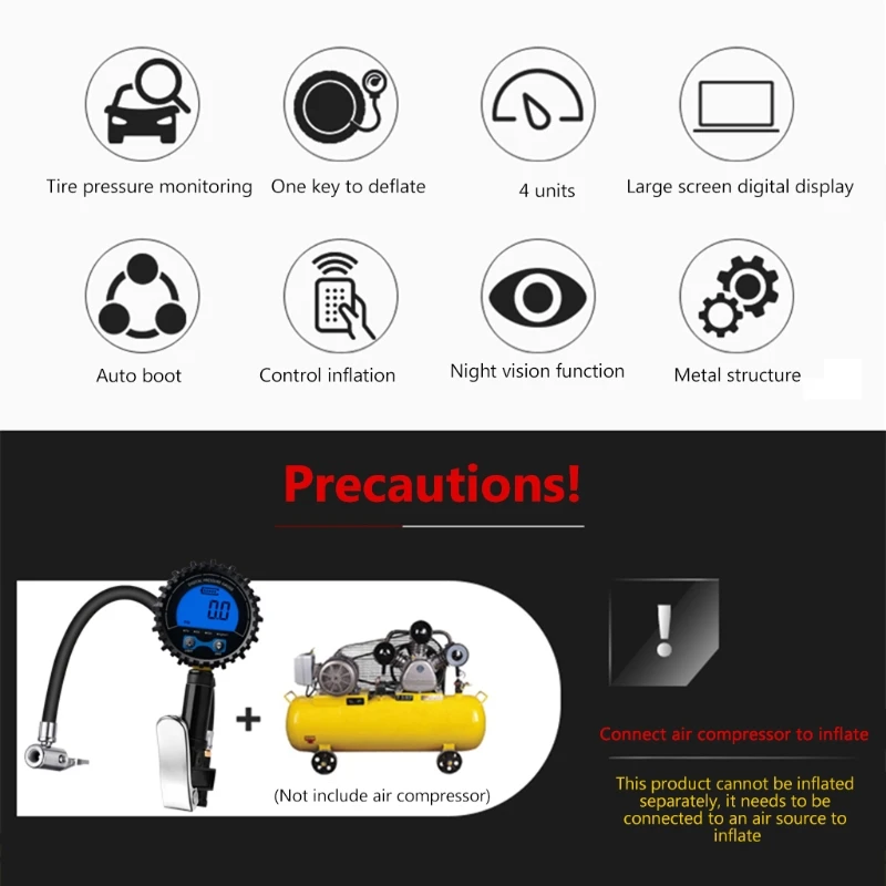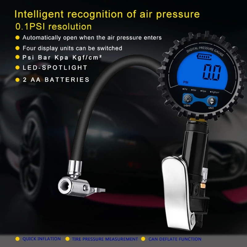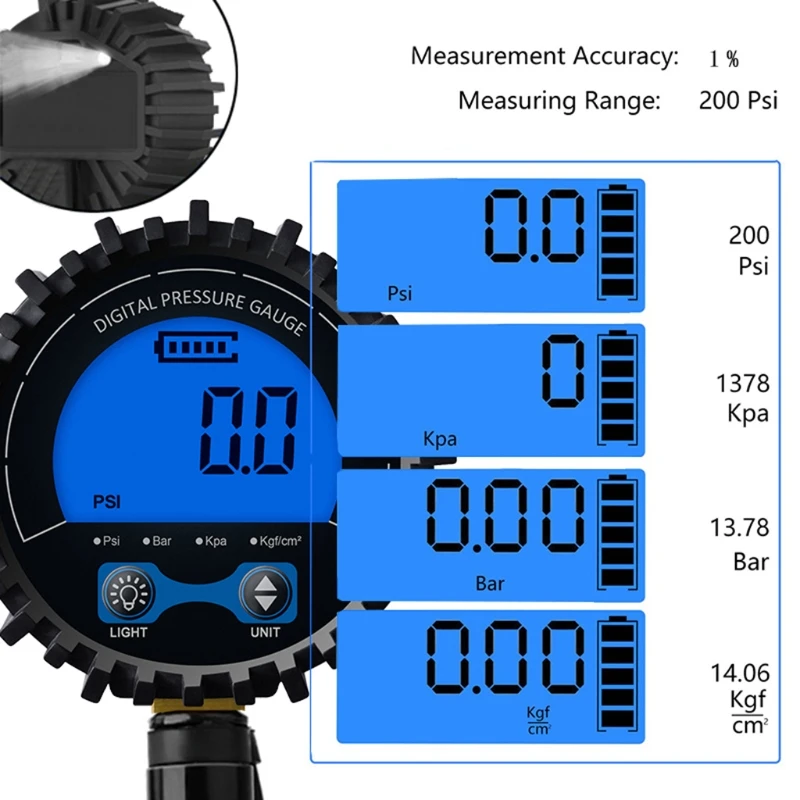 Измеряет давление в шинах из 3-200psi. Отображает измерения KGF, BAR, PSI, KPA.