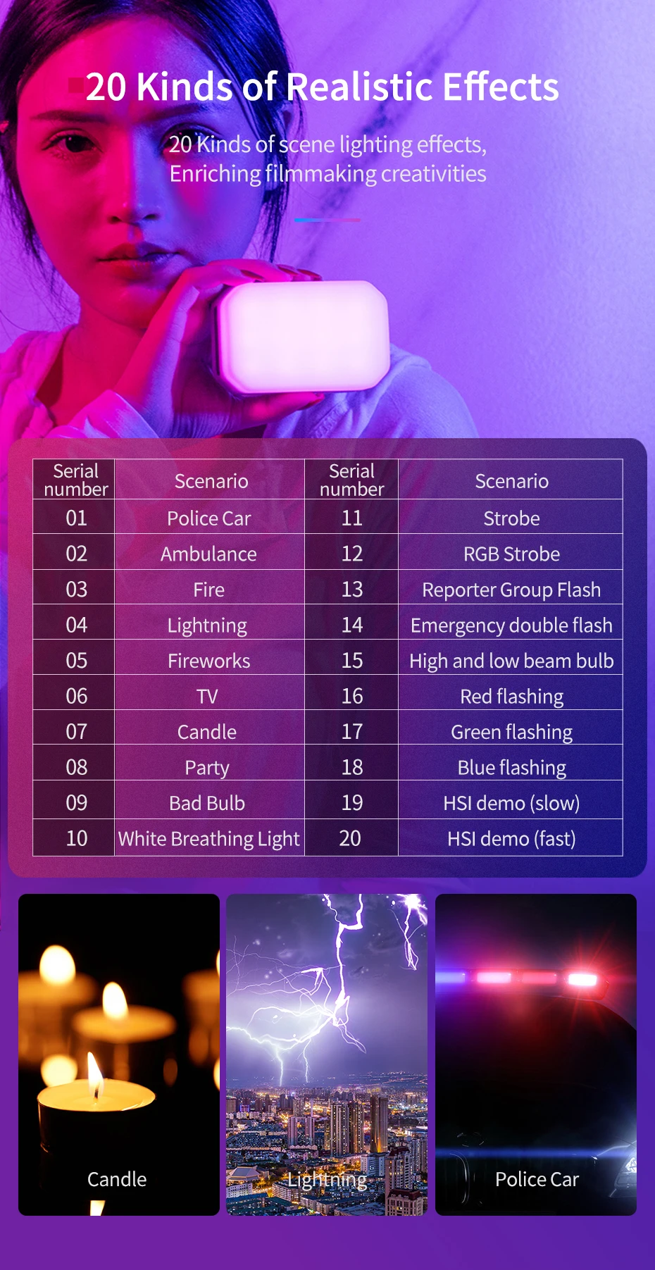 1-полицейская машина 2-скорая помощь 3-огонь 4-светильник ning 5-фейерверк 6-ТВ 7-свеча 8-вечерние 9-плохая лампа 10-белый дыхательный светильник 11-Стробоскоп 12- RGB Стробоскоп 13-Репортер групповая вспышка 14-аварийная двойная вспышка 15-лампа дальнего и ближнего света 16-красный мигающий 17-зеленый мигающий 18-синий мигающий 19-HSI demo (медленный) 20-HSI demo (быстрая)