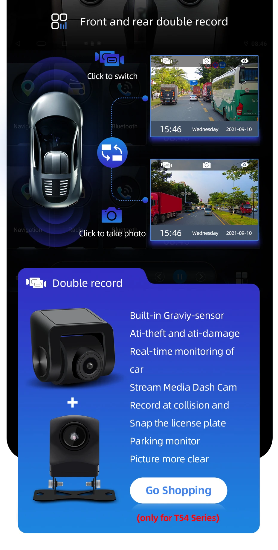 Поддерживает функцию переднего и заднего записи и потокового мультимедиа заднего вида.