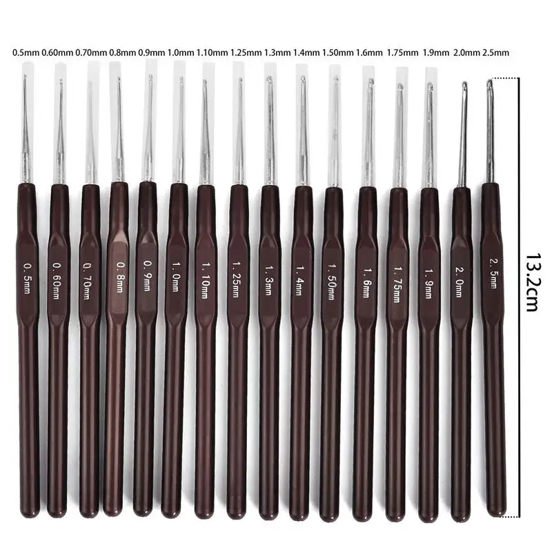 Размер вязания крючком: 0,5 мм, 0,6 мм, 0,7 мм, 0,8 мм, 0,9 мм, 1,0 мм, 1,1 мм, 1,25 мм, 1,3 мм, 1,4 мм, 1,5 мм, 1,6 мм, 1,75 мм, 1,9 мм, 2,0 мм, 2,5 мм