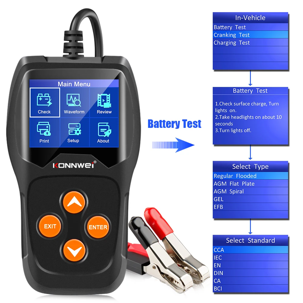 Автомобильный анализатор батареи KONNWEI KW600 12V работает гораздо быстрее и точнее, чем другие тестеры. Первоклассный STM-32 основной чип и с высоким уровнем точный усилитель откалиброван профессиональные устройства доставить вам надёжное результатов за считанные секунды!