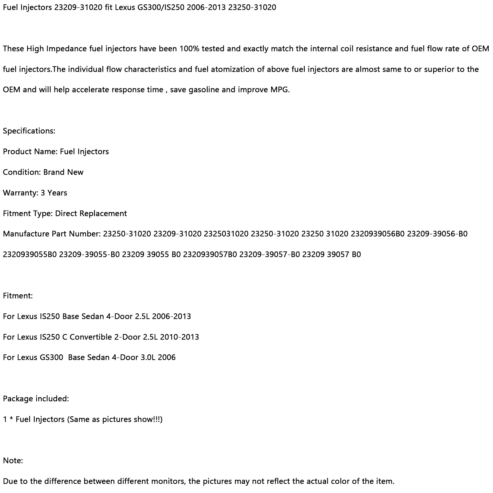 Fuel Injectors 23209-31020 fit For Lexus GS300/IS250 2006-2013 23250-31020