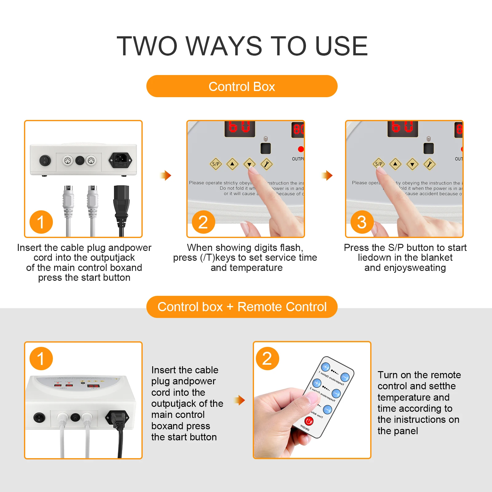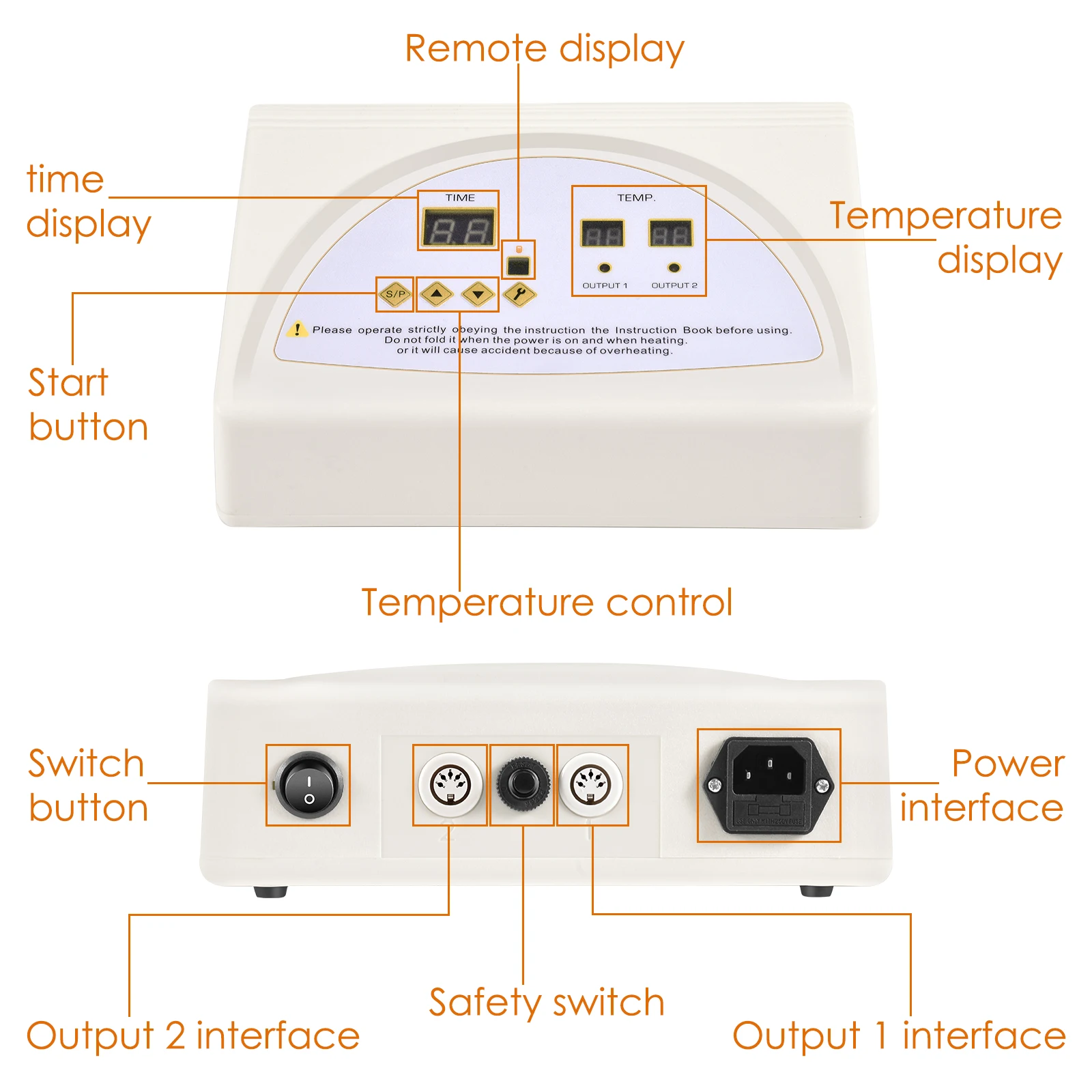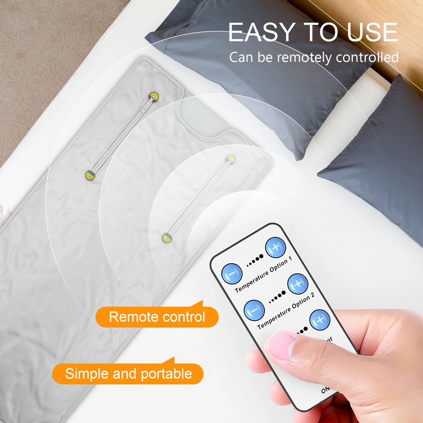 4. Использование: через контроллер для регулировки температуры от 35-75 градусов Цельсия, время может установить от 15-60 мин. Два зоны для похудения одеяло делают переднюю и заднюю часть тела для потери веса и детоксикации. Аккумулятор не входит в комплект дистанционного управления.
