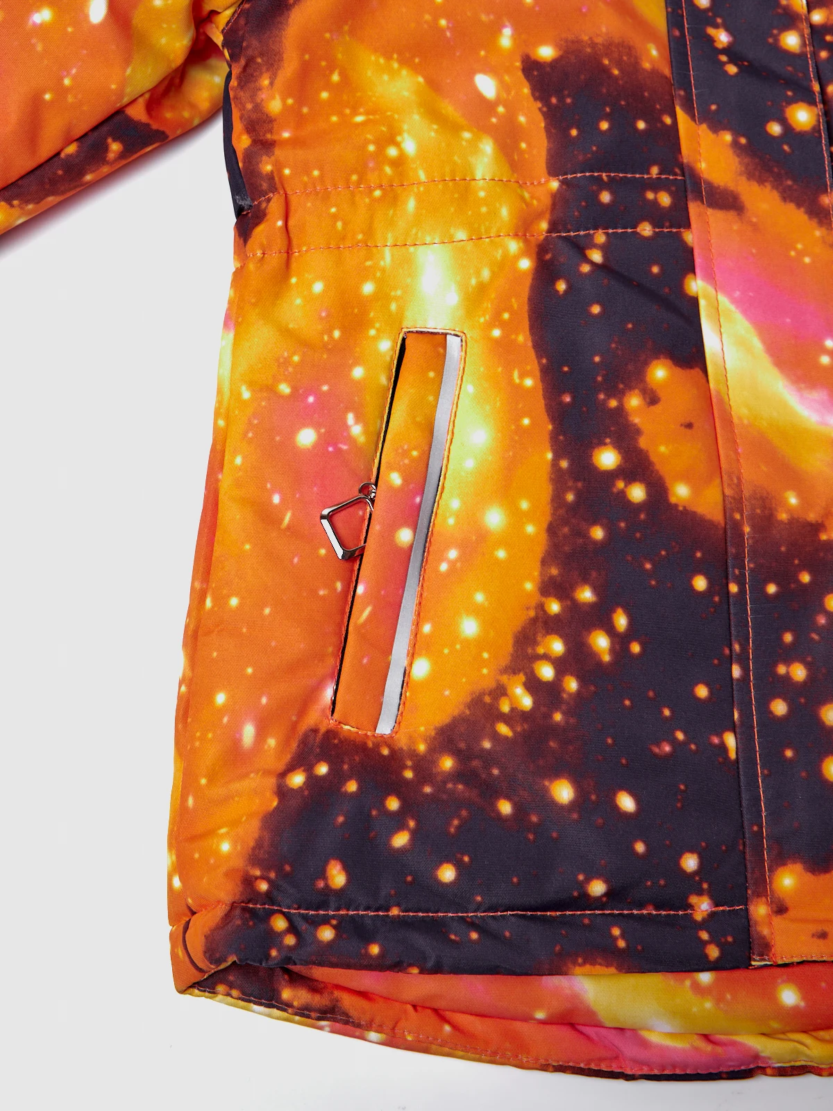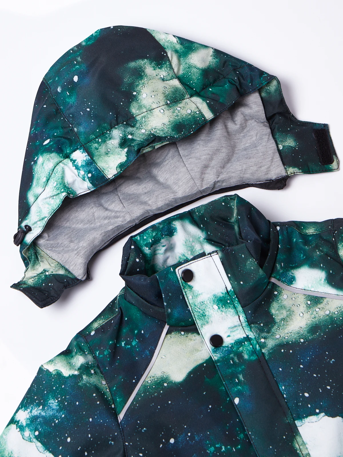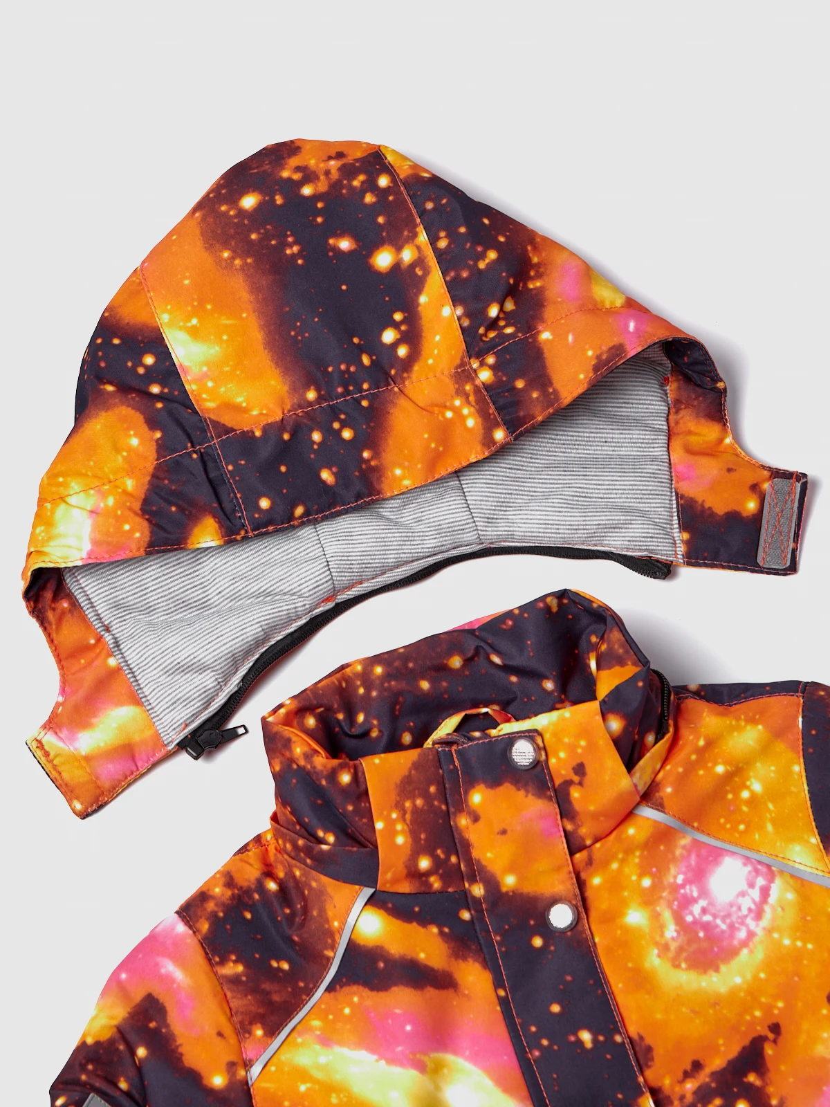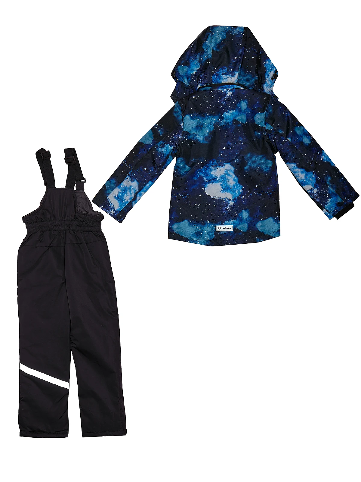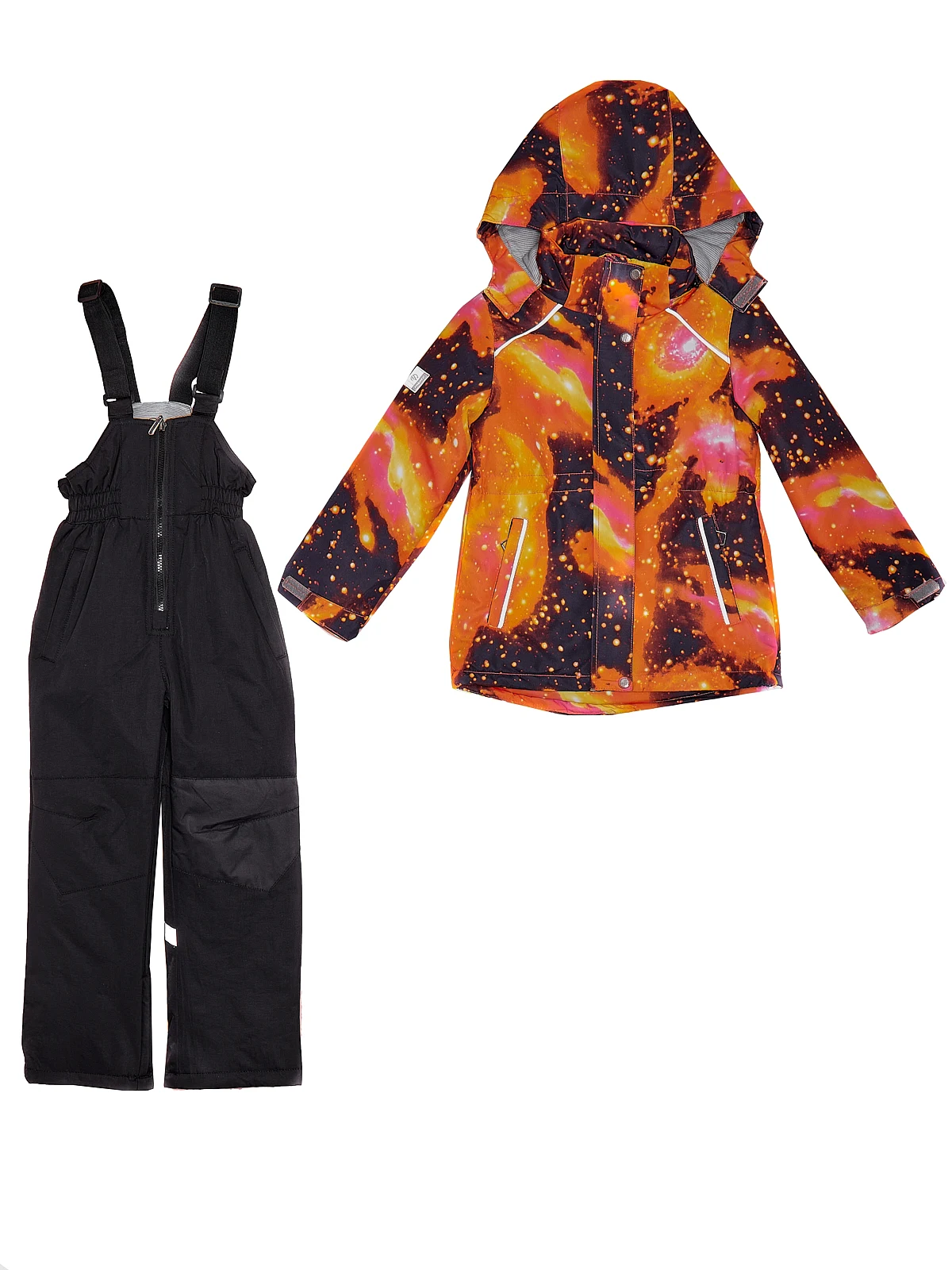 Детский комплект одежды состоит из куртки с розовым, синим, оранжевым или зеленым космическим принтом, и полукомбинезона. Легкий, но плотный материал не пропускает влагу, холодный воздух, но при этом позволяет телу дышать. Куртка с капюшоном на липучке застегивается на молнию, предусмотрены 2 прорезных кармана снаружи и потайной внутри. Болоньевые штаны на молнии также имеют пару карманов и резиновую вставку под грудью, что позволяет им растягиваться и сидеть по фигуре. Благодаря подтяжкам брюки можно регулировать в соответствии с ростом ребенка. Светоотражающие вставки обеспечат видимость вашего ребенка в темное время суток.