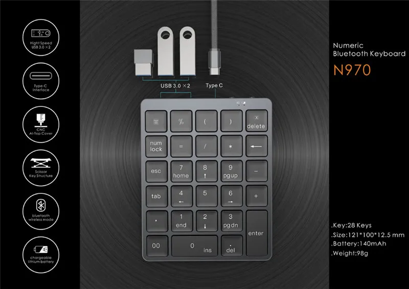 N970 портативная беспроводная Bluetooth цифровая клавиатура с usb-хаб-сплиттером два режима алюминиевый сплав мини-нумпад для учета задач
