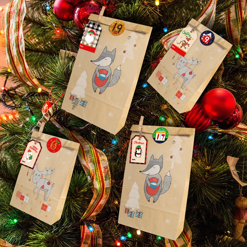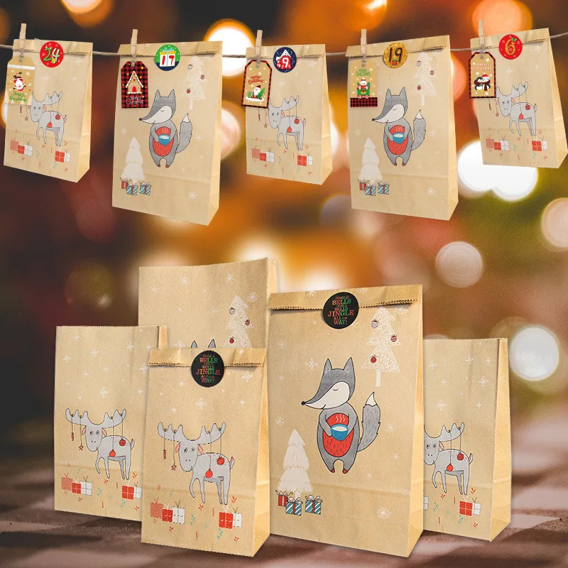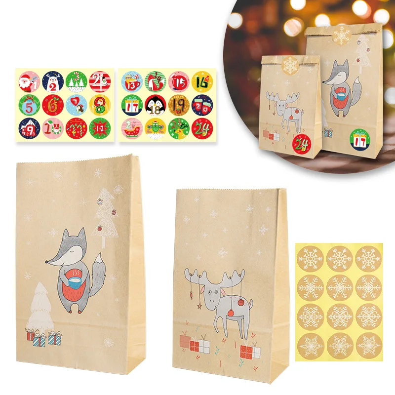 24 шт./компл. = 12 бумажных мешков с лисой + 12 бумажных мешков с оленем + 24 рождественских наклеек + 24 цифровых наклеек