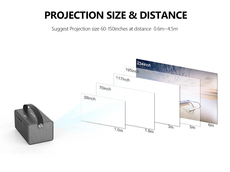 Размер проекции до 300 дюймов, предлагаем 50-180 дюймов, чтобы получить лучшие эффекты отображения