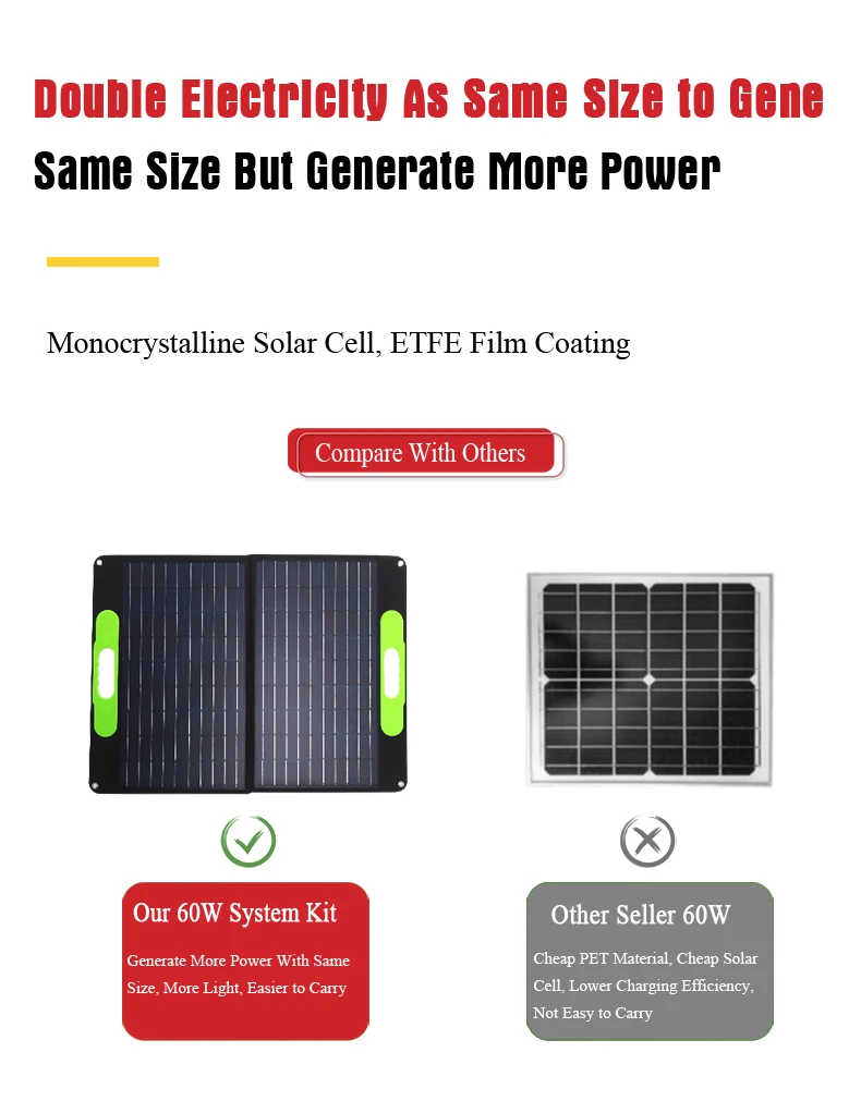 Qufu Jingyang Solar Energy Co., ltd монокристаллическое двойное USB Солнечное зарядное устройство имеет высокую эффективность преобразования, эффективность преобразования до 21%, В то время как большинство аналогичных продуктов на рынке составляет 15% или даже ниже. Независимо от того, заряжаете ли вы ноутбук с генератором или заправляете блок питания, солнечная энергия покрывает вас. Наши Складные портативные монокристаллические солнечные панели прочны, надежны и просты в использовании. Проводите солнце с помощью портативной солнечной энергии, где бы вы ни находились.