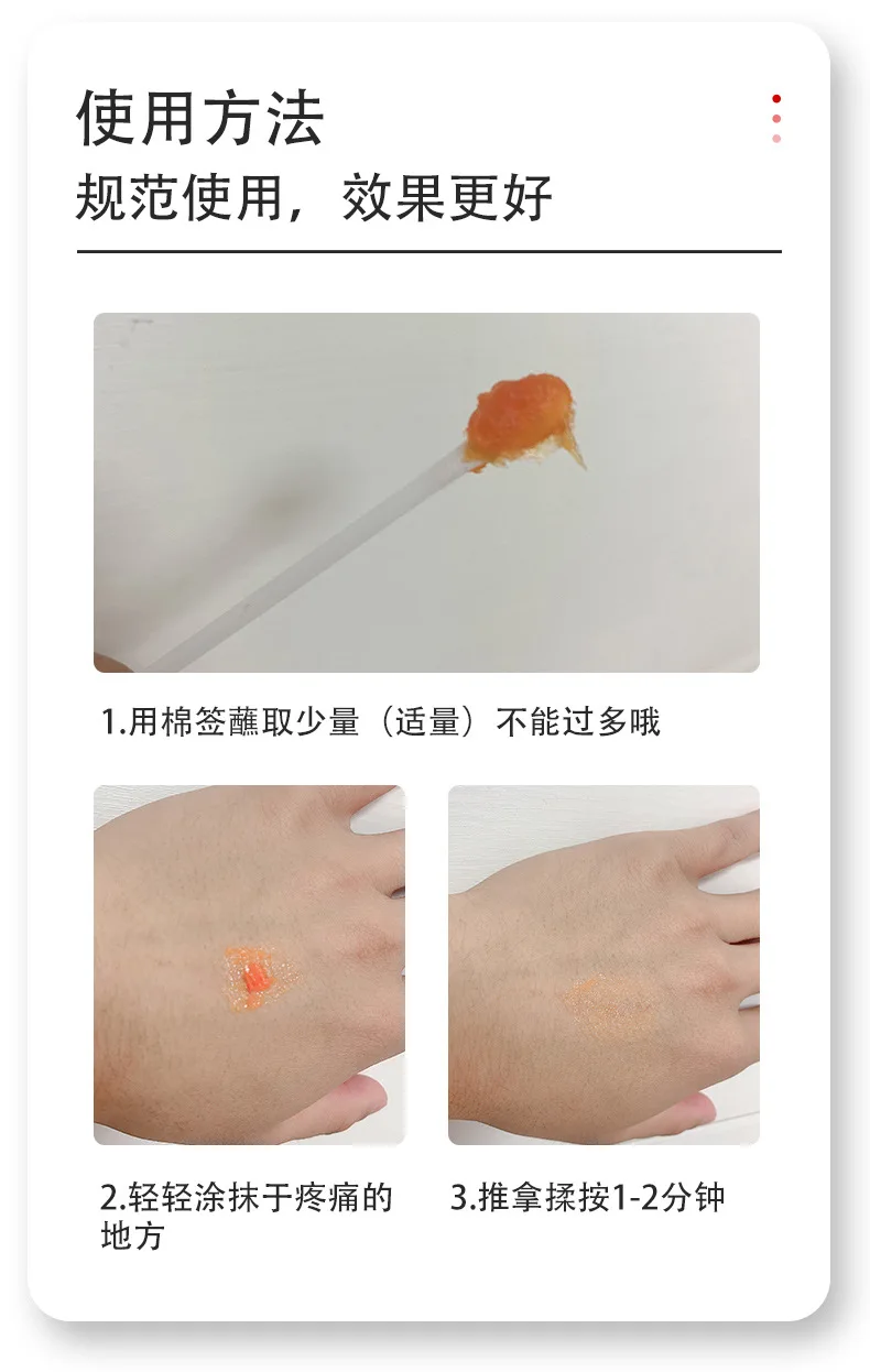 Примечание:Этот бальзам сильно горит для улучшения кровообращения, и он будет держать горение около 2-4 часов, поэтому мы советуем вам использовать это дневное время и применять немного в первый раз. Пожалуйста, положите там, где дети не могут прикоснуться и. Никогда не используйте крем, окунутый в глаза и кожную рану). Не используйте для теплой мышцы перед спортом.