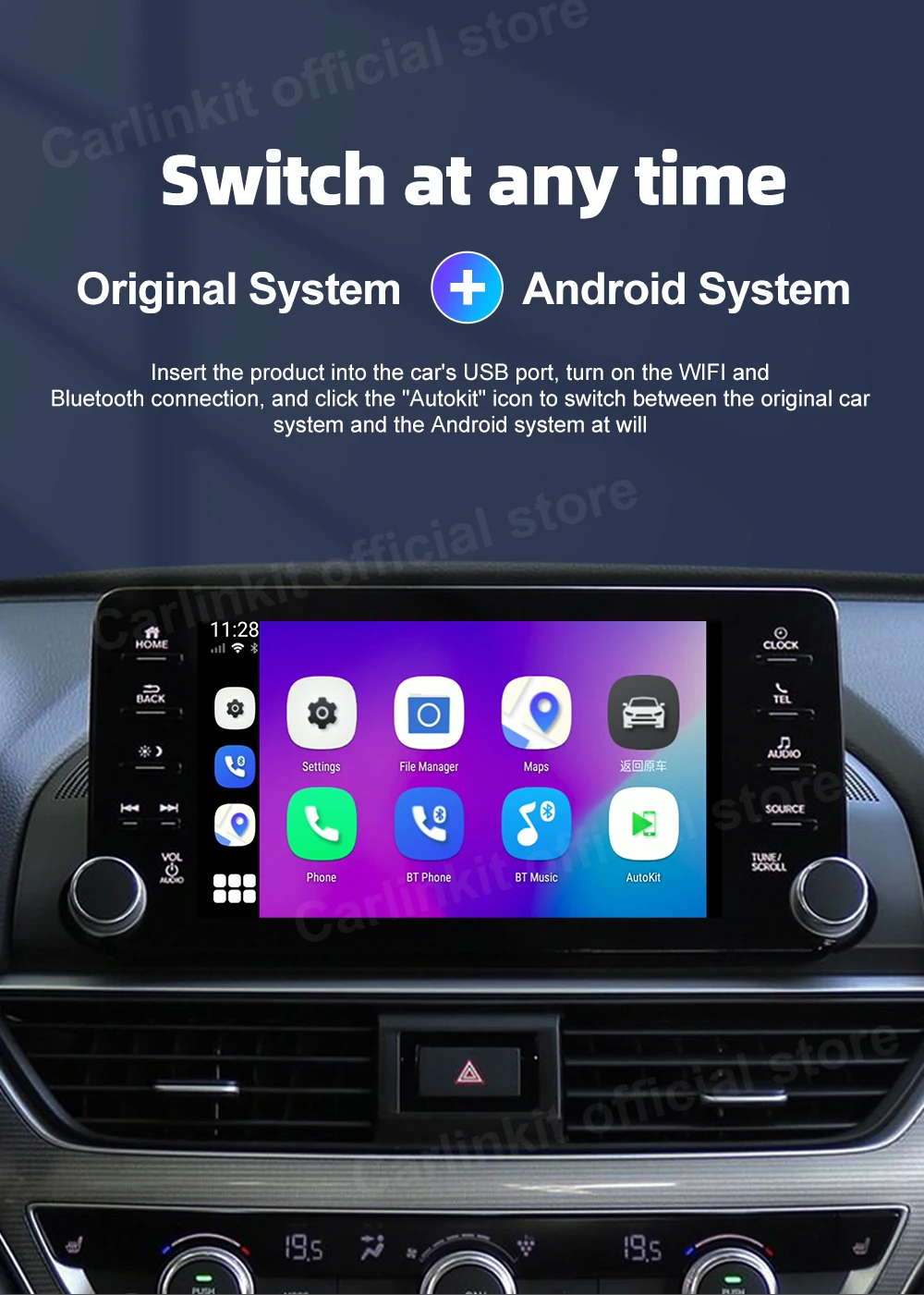 3. Три основные системы: вы можете использовать Carlinkit AI Box для переключения оригинальной автомобильной системы на три системы по желанию-Android 9,0, Apple CarPlay, Android Auto