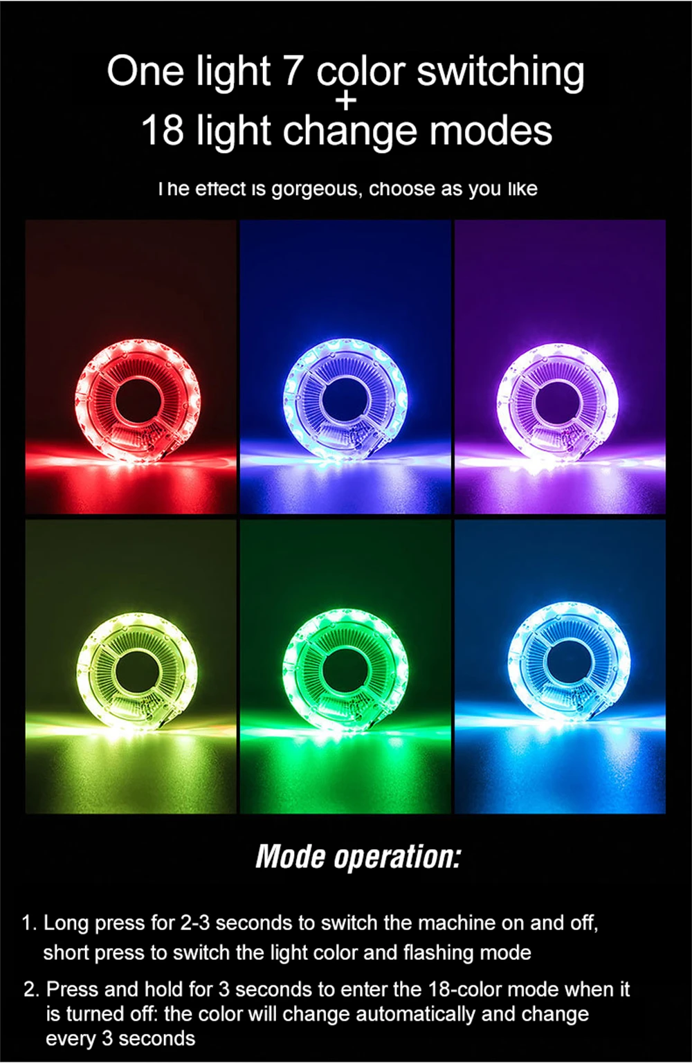 Функция: постоянное освещение, вспышка; 7 цветов поочередно; 18 режимов автоматически отображаются