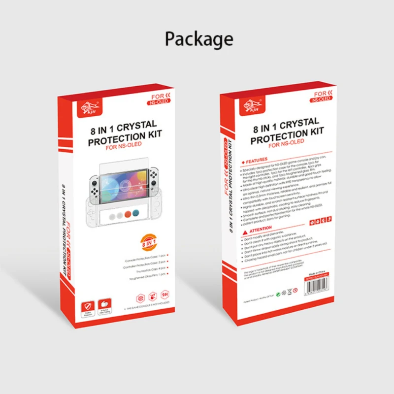 • В комплект входит защитный чехол 1 шт. для консоли, 1 шт. для правого контроллера, 1 шт. для левого контроллера, 4 шт. ручек для палочек большого пальца и 1 шт. пленка из закаленного стекла.