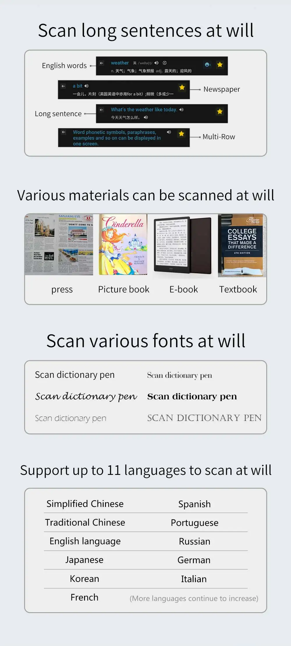 ★ Fast scanning: Translate in 0.3 seconds, 18 characters can be scanned in 1 second; You can scan one line or multiple lines, real-time fast scanning and recognition, you can read multiple blocks as fast as you can scan; you can read and translate with one scan, you can scan one line or multiple lines, and you can recognize phonetic symbols, parts of speech, and explain words by word segmentation. The accuracy is above 98%;