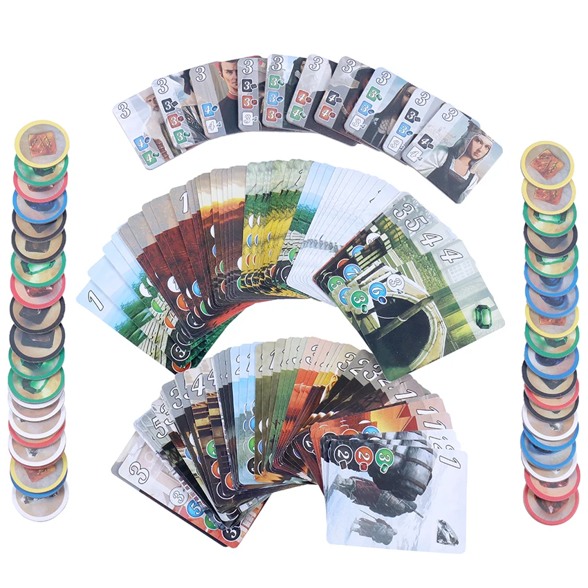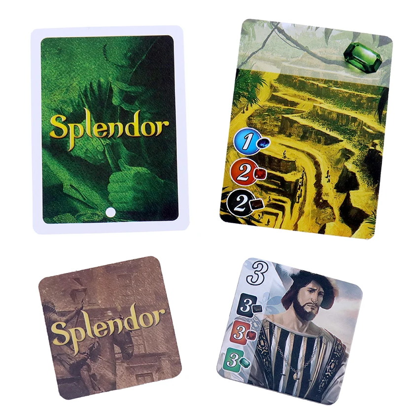 Splendor английский = 10 благородных плиток + 40 карт уровня 1 + 30 карт уровня 2 + 20 карт уровня 3 + 7 изумрудных жетонов (зеленый) + 7 сапфировых жетонов (синий) + 7 рубиновых токенов (красный) + 7 алмазных токенов (белый) + 7 токенов из оникса (черный) + 5 золотых жетонов (желтый)